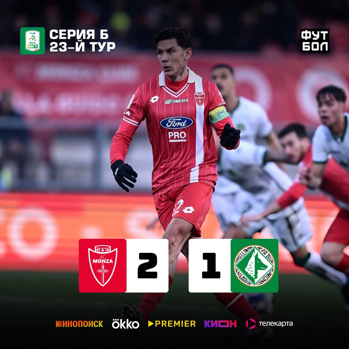 Монца побеждает 2-1. Причём, хозяевам пришлось спасать игру после пропущенного мяча в начале второго тайма. Монцу выручили звёздные Патрик Кутроне и Маттео Пессина. Бывшие игроки сборной Италии и таких клубов, как Милан, Валенсия, Аталанта - забили по голу и помогли своей команде продолжить борьбу за выход в Серию А. Сейчас они вторые и отстают от первого места всего на 3 балла!