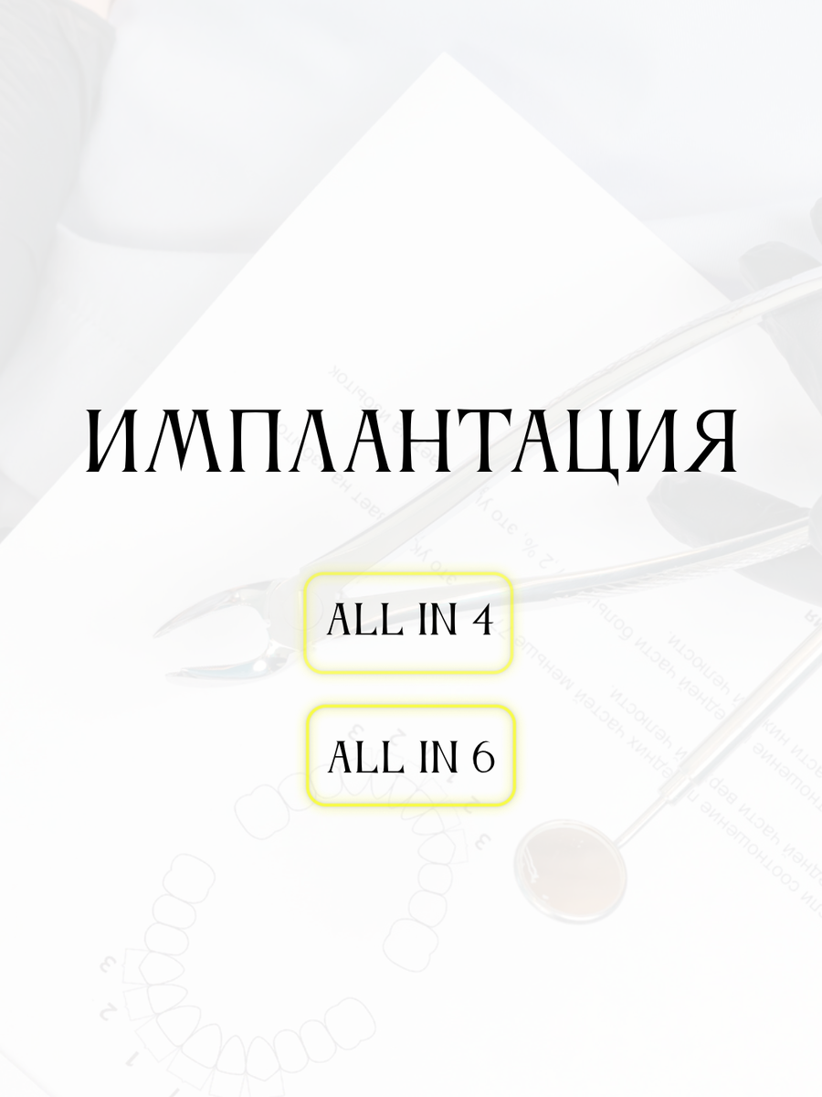 All-on-4 и All-on-6 — это протоколы тотальной имплантации, подразумевающие установку сразу четырех или шести имплантов в пределах одной челюсти, и далее их немедленную нагрузку временным протезом – сразу после операции или через неделю, после заживления. Такая имплантация направлена на создание стабильной и долговременной ортопедической конструкции с равномерным распределением жевательной нагрузки. В отличие от классической имплантации, требующей большого количества имплантов, протоколы All-on-4 и All-on-6 предполагает использование четырех или шести опор, размещенных в костной ткани. Чаще всего All-on-4 используют для восстановления нижней челюсти, так как из-за нагрузок кость сохраняется там лучше всего.