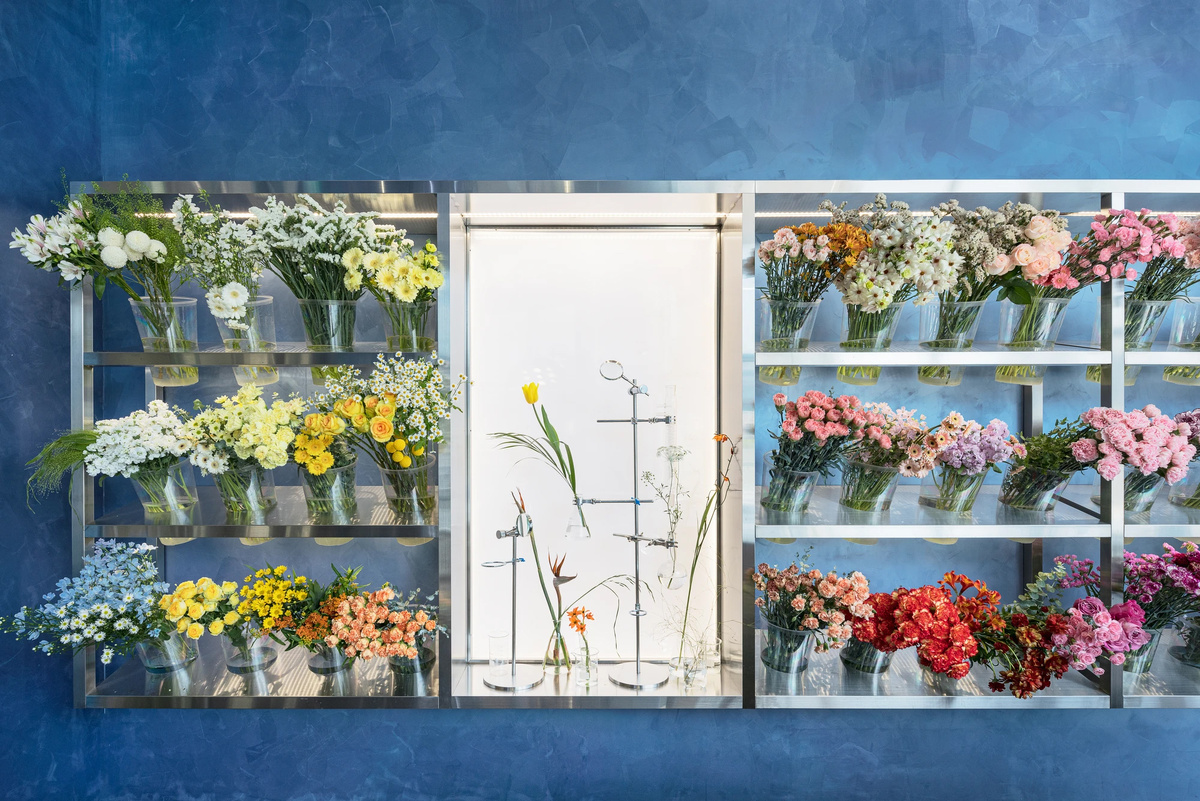 С недавнего времени я собираю интерьеры в голубом. Хочу сочинить самый красивый голубой из всех существующих, для того, чтобы покупатели X KRASKY смогли насладиться им по полной. И вот тут мне попалось кое-что интересное... О'цвет - это название магазина, а Обычная странность - название бюро, его создавшего. Магазин примечателен тем, что делает цветок не товаром, а объектом исследования, а покупателя - учёным, его исследующим. Нужно пояснить, что учёный в данном контексте - это не тот у кого корка, звание, аспирантура, халат, монокль и самомнение, а тот, кто ищет и хочет понять. Мы все своего рода учёные. Да и такой подход, который делает из потребителя исследователя и соучастника мне очень по душе. Обычный цветочный магазин предлагает мягкие ассоциации: романтика, сочувствие, праздник, извинение. Лепестки и стебли размещаются в вазах на подставках, которые расположены так, чтобы вызвать эмоциональную реакцию при покупке. Для второго магазина О"цвет в новом городе Донгтан в Сеуле - р