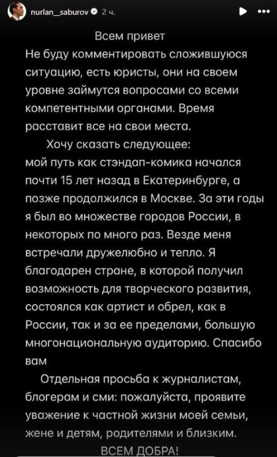«Не буду комментировать» — Сабуров высказался насчёт своей депортации Стендап-комик в Instagram рассказал, что юристы займутся решением проблемы. А сам он поблагодарил своих фанатов. «Я благодарен стране, в которой получил возможность для творческого развития, состоялся как артист и обрёл, как в России, так и за её пределами, большую многонациональную аудиторию. Спасибо вам». https://dzen.ru/id/65c879adfcd0940ad7548a95