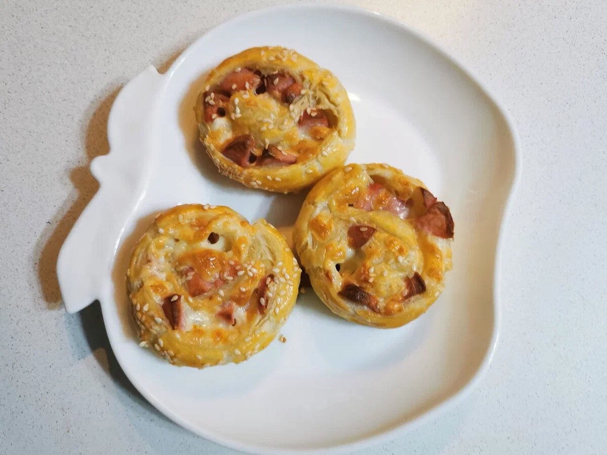 Слоеное тесто идеально подходит для приготовления множества вкусных блюд и выпечки. Используя готовое тесто на приготовление выпечки вы затрачиваете минимальное количество времени, а изделия получаются с хрустящей корочкой, нежной сердцевиной и сочной начинкой. Для приготовления улиток понадобится: слоеное бездрожжевое тесто 500 гр. сосиски 3 шт. сыр 50-100 гр. яйцо 1 шт. белый кунжут мука пшеничная - немного для раскатки. Готовому замороженному тесту даем растаять, немного раскатываем, и выкладываем начинку рубленные сосиски, и сыр, думаю вполне можно использовать и колбасу, и даже добавить немного зелени. Скручиваем в рулет, хорошо закрепляем края. Смазываем взбитым яйцом всю поверхность рулета, и посыпаем кунжутом. Далее нарезаем рулет на небольшие кусочки, и выкладываем на пергамент, немного придавливаем сверху, смазываем яйцом и присыпаем кунжутом, и отправляем в разогретую духовку до 180°С, примерно на 30 минут, смотрите по своей духовке. И получаем вкуснейшие улитки, которые м
