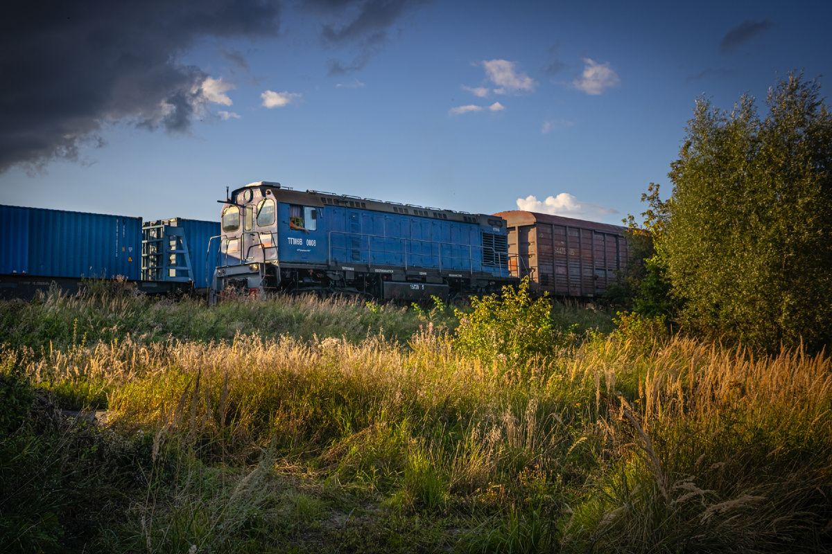 На фотографии представлен тепловоз ТГМ6В-0008, выполняющий маневровые работы по станции Карьер, Купавинского ППЖТ тёплым летним вечером. Данный кадр сделан в августе 2025 года.
