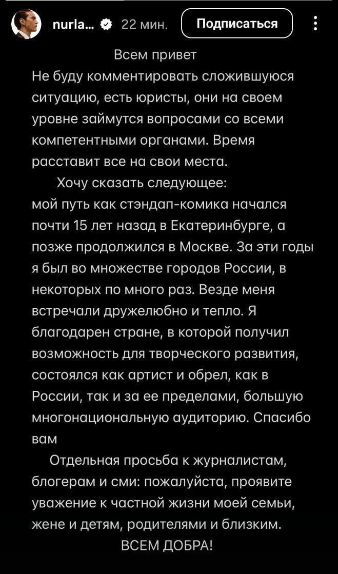 Комик Нурлан Сабуров впервые высказался после решения о запрете на въезд в Россию сроком на 50 лет