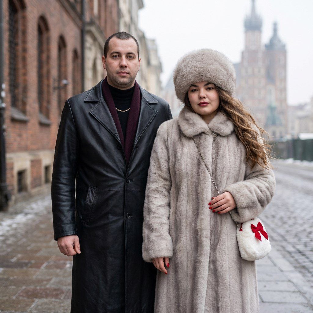😀Выбираем "нейросети" 😀Нажимаем "Nano Banana" 😀Нажимаем "Nano Banana Pro" 😀Прикрепляем через скрепку свое фото и выбранный промпт 😀Наслаждаемся результатом😍 Создай фото не меняя черты лица и цвет волос "Стильная зимняя уличная пара в городской среде при мягком рассеянном свете. Мужчина в длинном черном кожаном тренч-коте с широкими лацканами, матовой текстуры, застегнутом частично — под ним черный тонкий гольф (водолазка) и темно-бордовый шарф, заправленный внутрь; на шее простая золотая цепочка. Короткая аккуратная стрижка, ухоженные руки без перчаток. Женщина в полном, пышном пальто из светло-серо-бежевой меховой ткани с выраженной полосатой структурой, длинное пальто до колен; крупная круглая меховая шапка в тон пальто (ушанка/шляпа из густого меха). Длинные волнистые волосы распущены и струятся по плечу, слегка растрепанные ветром. Макияж в нюдовом зимнем стиле: ровный, слегка сияющий тон кожи, легкий румянец на щеках, подчеркнутые брови, нейтральные матовые тени, аккуратна