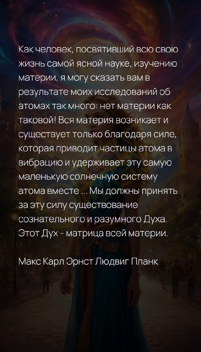 Как человек, посвятивший всю свою жизнь самой ясной науке, изучению материи, я могу сказать вам в результате моих исследований об атомах так много: нет материи как таковой! Вся материя возникает и существует только благодаря силе, которая приводит частицы атома в вибрацию и удерживает эту самую маленькую солнечную систему атома вместе ... Мы должны принять за эту силу существование сознательного и разумного Духа. Этот Дух - матрица всей материи. Макс Карл Эрнст Людвиг Планк Архитектура вашей души | Натальная карта T | VK | Pin | YouTub | Dzen #опыт #честность #иммунитет #какстатьсчастливым #молодость #квантовыйскачок #мирвдвоем #вера #светлыйпуть #8число #8февраля