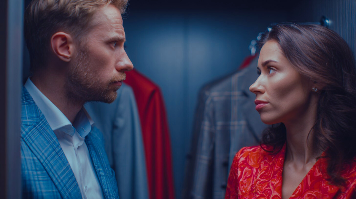Марина стояла у зеркала в пол, прикладывая к себе какое-то платье. Увидев мужа в отражении, она резко развернулась, инстинктивно прикрывая собой стойку с блузками.