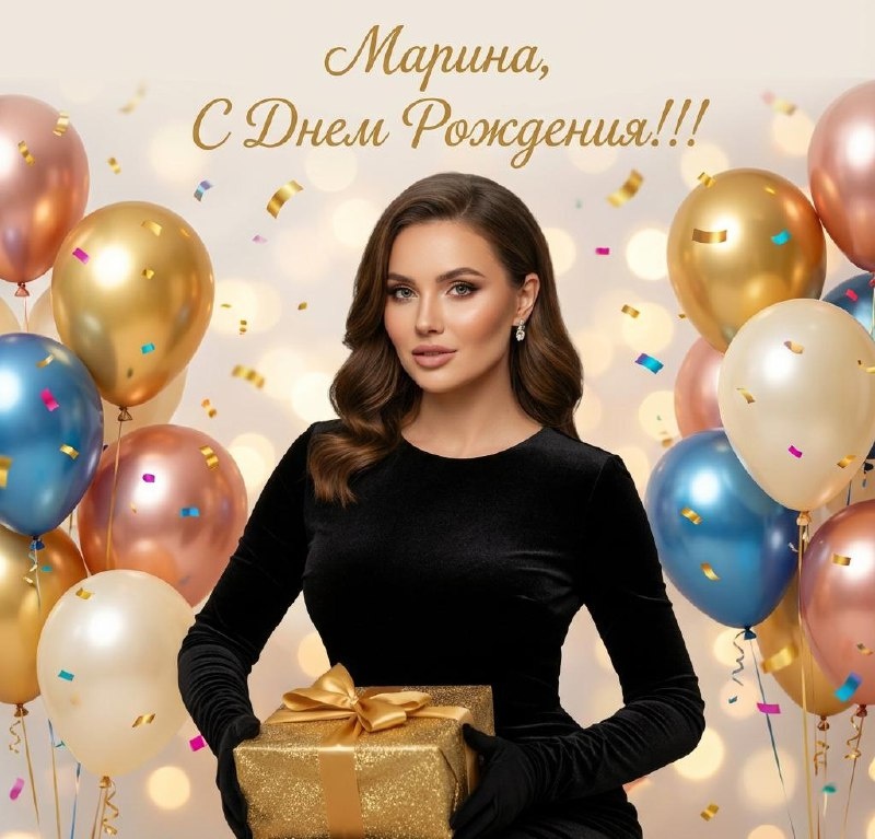 Модель: Nano Banana Сгенерировать🪄 ## Основная концепция Поздравительная открытка ко дню рождения Роскошный редакционный стиль Яркое праздничное оформление с хорошим вкусом Чистая композиция с пространством для заголовка ## Модель (именинница) Взрослая женщина славянской внешности Светлая кожа, естественные черты лица МАКСИМАЛЬНО ТОЧНОЕ соответствие референсному изображению Легкая дружелюбная улыбка (без преувеличенных эмоций) Расслабленная поза Резкий фокус на лице ## Фон и атмосфера Разноцветные воздушные шары Конфетти Мягкое боке от огней Мягкий рассеянный студийный свет Теплая естественная палитра ## Текст Четкий русский текст как часть дизайна: "Марина, С Днем Рождения!!!" (точное написание, читабельный шрифт) ## Технические параметры Четкий дизайн готовый к печати Яркие насыщенные цвета Высокая детализация Фотореалистичный человек + графический макет открытки ## Исключения (что НЕ должно быть) Преувеличенная улыбка до ушей Крик или открытый рот Кар