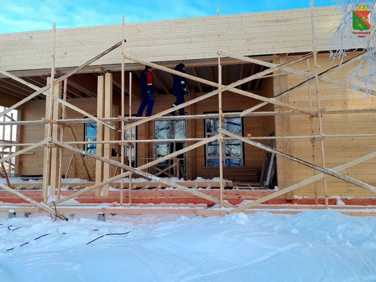 Березник Вологодского округа. Строители уже подвели здание под крышу, установили окна и двери, начали монтировать кровлю и настилать пол. «Общая площадь здания нового ДК составит около 335 кв. метров. На половине этой площади разместятся зрительный зал и сцена. Также проект предусматривает обустройство летней эстрады. В планах перевезти в дом культуры и филиал местной библиотеки», — прокомментировал глава муниципалитета Вячеслав Панов. После общестроительных работ подрядчик перейдёт к отделке и благоустройству прилегающей территории. Фото: пресс-служба Администрации Вологодского округа. Telegram | ВКонтакте | Rutube | Одноклассники | Дзен