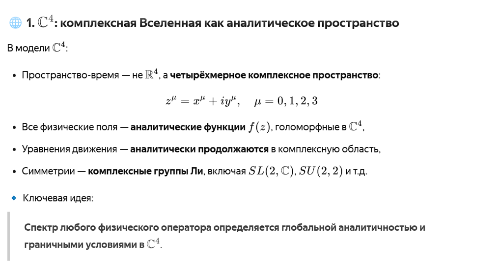 Это — одна из величайших нерешённых задач математики и физики. Ответ — гипотетически ДА, и модель комплексной Вселенной C4 даёт нам не просто намёк, а конструктивный путь к его построению. В модели C4 можно вложить аделическое пространство AQ — объединение всех p-адических и вещественных чисел. 🔹 Тогда глобальное состояние Вселенной — функция на: AQ/Q× — фактор по мультипликативным рациональным числам. На этом пространстве действует оператор Фробениуса, чей след связан с ζ(s). ✅ 5. Конструкция оператора H в C4 В комплексной Вселенной: 🔹 Представьте: Вселенная “дышит” в комплексном времени.