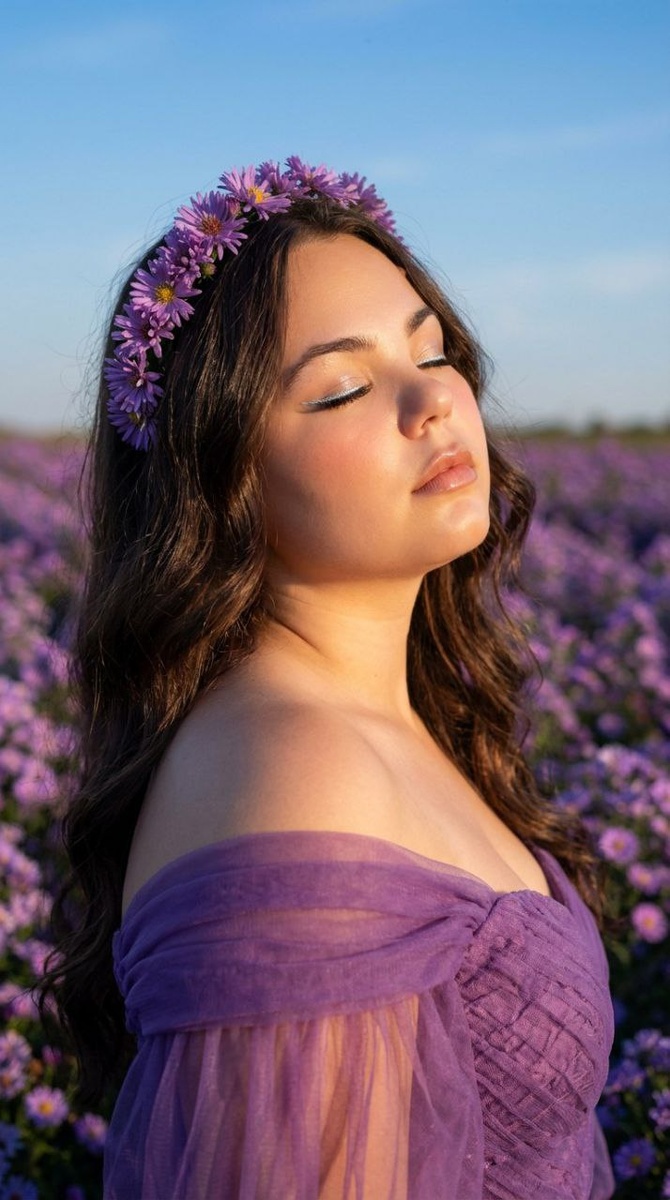 😀Выбираем "нейросети" 😀Нажимаем "Nano Banana" 😀Нажимаем "Nano Banana Pro" 😀Прикрепляем через скрепку свое фото и выбранный промпт 😀Наслаждаемся результатом😍 Создай фото не меняя черты лица и цвет волос. Ультрареалистичный cinematic editorial-портрет, вертикаль 9:16. Молодая девушка и эффектом glass skin. Макияж в корейском стиле: сияющий тон, мягкий персиково-розовый румянец, выразительные глаза с серебряным лайнером, длинные ресницы, нюдовый омбре-блеск губ. Очень длинные волнистые волосы, украшены фиолетовой цветочной короной. Фиолетовое кутюрное платье off-shoulder из тюля и мягкой фактурной ткани. Поза в полуобороте, голова приподнята, глаза закрыты. Локация — цветущее поле фиолетовых астр, мягкий боковой солнечный свет, голубое небо. Романтичная, мечтательная атмосфера, высокая детализация, ultra-HD, cinematic, 16K. #женские@annapromtii20 #летние@annapromtii20