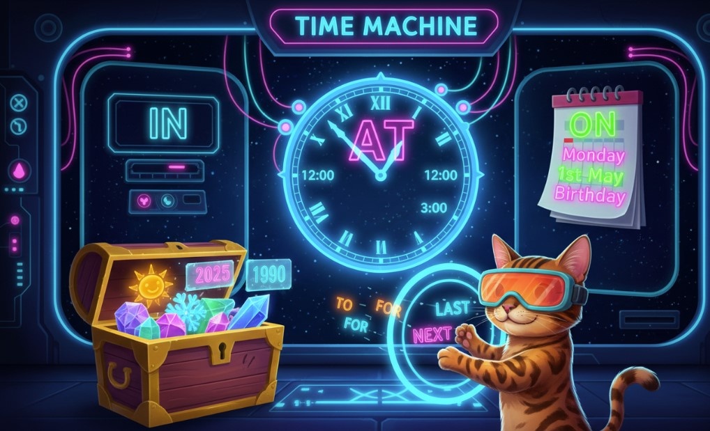 Мур-привет! Готовь свои часики! Сегодня мы не просто гуляем, мы путешествуем во времени! Я, Фаня, буду твоим Хранителем Времени. У времени в английском языке есть три главных двери: AT, IN и ON. Если ты перепутаешь дверь, то можешь опоздать на обед или прийти на вечеринку в прошлом веке! Чтобы этого не случилось, я нарисовала для тебя “Пирамиду Времени”. Держи самый подробный гид по предлогам времени! Учить английский спокойно, с уважением к своему ритму жизни — это реально. Я приглашаю на онлайн-уроки, где всё внимание уделяется исключительно вам и вашим целям. Узнать подробности и записаться на занятие можно на моей странице: Обо мне | Цены (Grammar A1 / Prepositions of time) Время — это хитрая штука. Иногда оно маленькое, как секунда, а иногда огромное, как столетие. Для каждого размера времени у нас есть свой предлог. Запомни мое золотое правило «От малого к большому»: AT используется для самого точного времени. Это как лазерная указка. Я целюсь прямо в минуту! 1. Время на часах (C