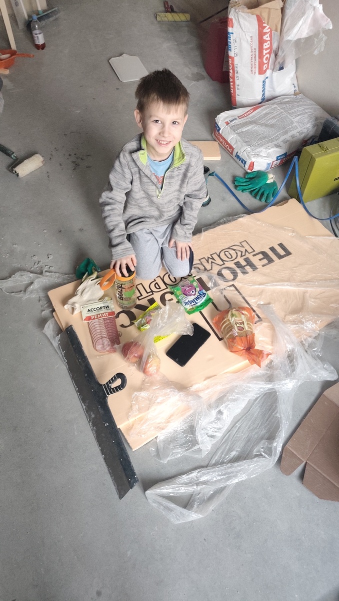Лайфхак для тех, кому тоже приходится делать ремонт с ребёнком. Берите больше еды. Вадима это довольно надолго заняло.