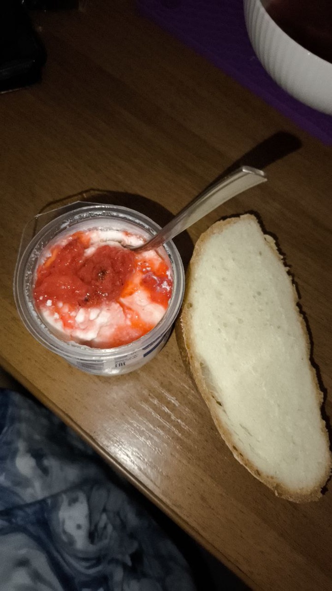У меня на вечерний перекус йогурт со свежими ягодками протёртыми с сахаром и булочка
