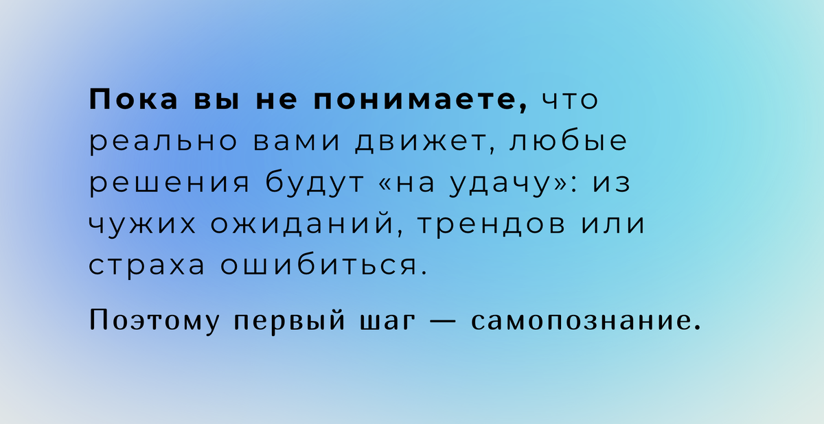 Важно: самопознание — это не «покопаться в голове», а собрать факты о себе. Что даёт энергию, что забирает, где вы устойчивы, а где вас уносит.