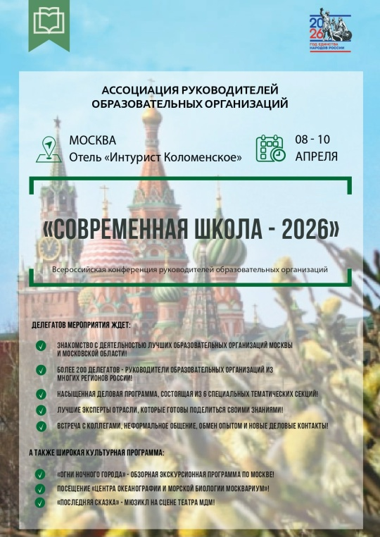 Конференция состоится с 8 по 10 апреля в городе Москва. Участники обсудят стратегии государственной национальной политики РФ, инструменты удержания кадров в общеобразовательной организации, усиление педагогического ресурса школы и многое другое. 👩🏫Участниками станут представители региональных органов управления образованием, руководители и ведущие специалисты образовательных организаций из большинства регионов России. 📌Для всех желающих присоединиться к работе конференции необходима предварительная регистрация по ссылке: clck.ru/3RenkK