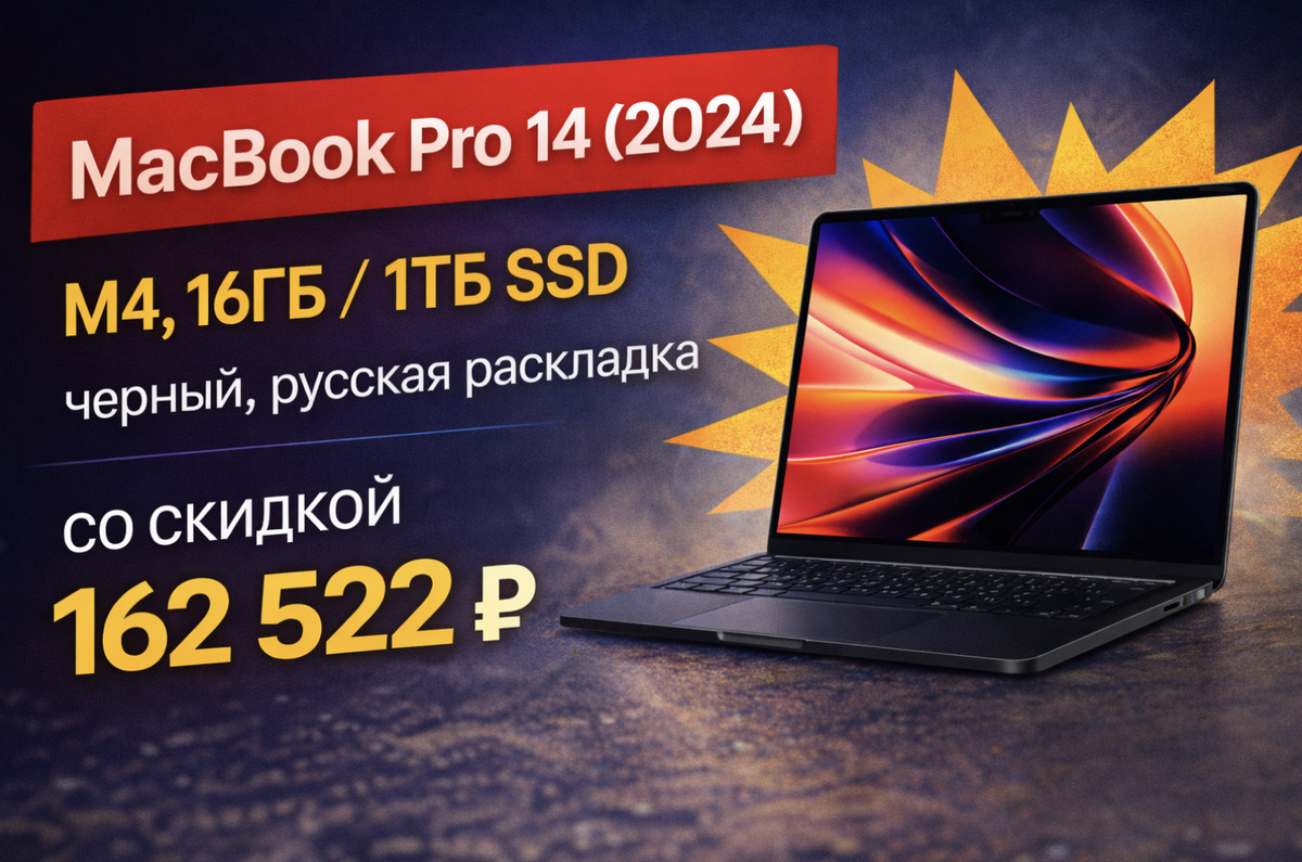 MacBook Pro 14 (2024) на M4 — это как раз второй сценарий: ноутбук “на работу”, а не “на терпение”. И при цене 162 522 ₽ (вместо 292 234 ₽) это уже не просто мечта, а очень конкретная выгодная покупка — особенно в конфигурации 16 ГБ RAM + 1 ТБ SSD. Если вы работаете с файлами (фото/видео/проектами/архивами), то 256–512 ГБ часто заканчиваются неожиданно быстро.