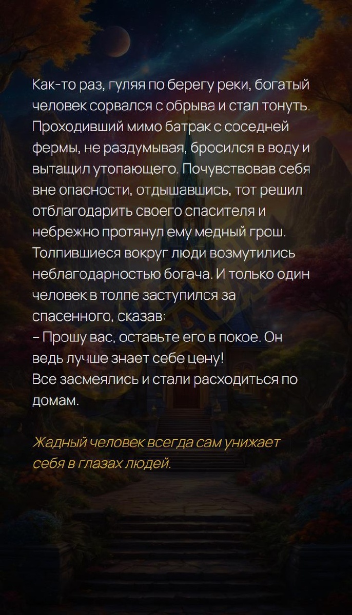 ✨ Как-то раз, гуляя по берегу реки, богатый человек сорвался с обрыва и стал тонуть. Проходивший мимо батрак с соседней фермы, не раздумывая, бросился в воду и вытащил утопающего. Почувствовав себя вне опасности, отдышавшись, тот решил отблагодарить своего спасителя и небрежно протянул ему медный грош. ✨ Толпившиеся вокруг люди возмутились неблагодарностью богача. И только один человек в толпе заступился за спасенного, сказав: ✨ – :Прошу вас, оставьте его в покое. Он ведь лучше знает себе цену! ✨ Все засмеялись и стали расходиться по домам. ✨ Жадный человек всегда сам унижает себя в глазах людей. Архитектура вашей души | Натальная карта T | VK | Pin | YouTub | Dzen #чудокаждыйдень #бытьсобой #простыерадости #прорыв #денежныйпоток #иммунитет #проводник #мирвнутри #короткоиясно #8число #8февраля