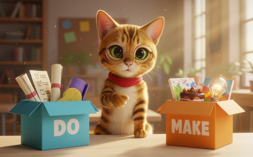 Мур-р-рвет! Я — Фаня, самая умная бенгальская кошка в интернете, и сегодня я научу вас не путаться в двух хитрых английских клубочках: Do и Make. Знаю, знаю, для вас, людей, они переводятся одинаково — «делать». Но для нас, носителей английского (и кошачьей мудрости), это две абсолютно разные вселенные! Если вы скажете «I did a mistake», мой хвост нервно дернется. Давайте разложим всё по полочкам (или по мисочкам?)! Учить английский спокойно, с уважением к своему ритму жизни — это реально. Я приглашаю на онлайн-уроки, где всё внимание уделяется исключительно вам и вашим целям. Узнать подробности и записаться на занятие можно на моей странице: Обо мне | Цены Запомните простое правило, которое работает в 90% случаев. Представьте меня, Фаню. Мы используем DO, когда говорим о скучных (но нужных) делах, работе и уходе за собой. Здесь мы ничего не мастерим руками, мы просто функционируем. Дом и Обязанности (Chores) Это то, что приходится делать снова и снова. Скукота! Работа и Учеба (Work &