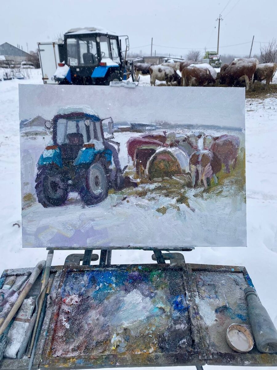 ! Это одно из любимых мест в этих окрестностях. Здесь все, что я люблю старые комбайны, ржавеющие машинки и коровки 😁. Вчерашний холст, 50х70 см. Чуть попозже добавлю несколько фотографий процесса с этими забавными рогатыми ))) #аргамач #oilpainter #живопись