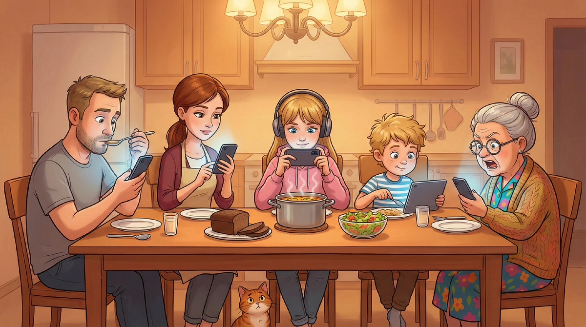 Через десять минут за столом сидело пять человек. Щи остывали. Хлеб лежал нетронутый. И пять экранов светились голубым. Тёма смотрел мультик. Маша снимала типа рилс. Жена сравнивала цены на кастрюли. Бабушка переписывалась с Валей. А я сидел и думал: мы же семья. Мы рядом. Но каждый сейчас на своей планете, и между нами — как стеклянные стены.