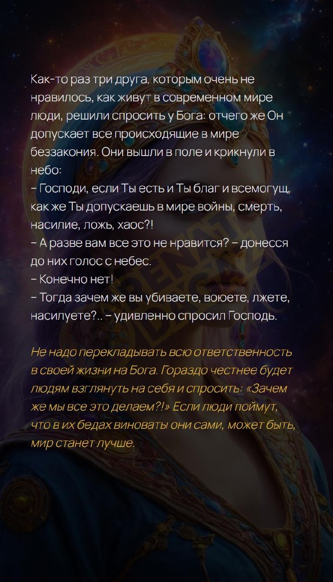 ✨ Как-то раз три друга, которым очень не нравилось, как живут в современном мире люди, решили спросить у Бога: отчего же Он допускает все происходящие в мире беззакония. Они вышли в поле и крикнули в небо: ✨ – :Господи, если Ты есть и Ты благ и всемогущ, как же Ты допускаешь в мире войны, смерть, насилие, ложь, хаос?! ✨ – :А разве вам все это не нравится? :– донесся до них голос с небес. ✨ – :Конечно нет! ✨ – :Тогда зачем же вы убиваете, воюете, лжете, насилуете?.. :– удивленно спросил Господь. ✨ Не надо перекладывать всю ответственность в своей жизни на Бога. Гораздо честнее будет людям взглянуть на себя и спросить: «Зачем же мы все это делаем?!» Если люди поймут, что в их бедах виноваты они сами, может быть, мир станет лучше. Архитектура вашей души | Матрица судьбы T | VK | Pin | YouTub | Dzen #уверенность #чудокаждыйдень #любовьмиру #суть #берегисебя #позитив #ямогу #радость #мысль #8число #8февраля