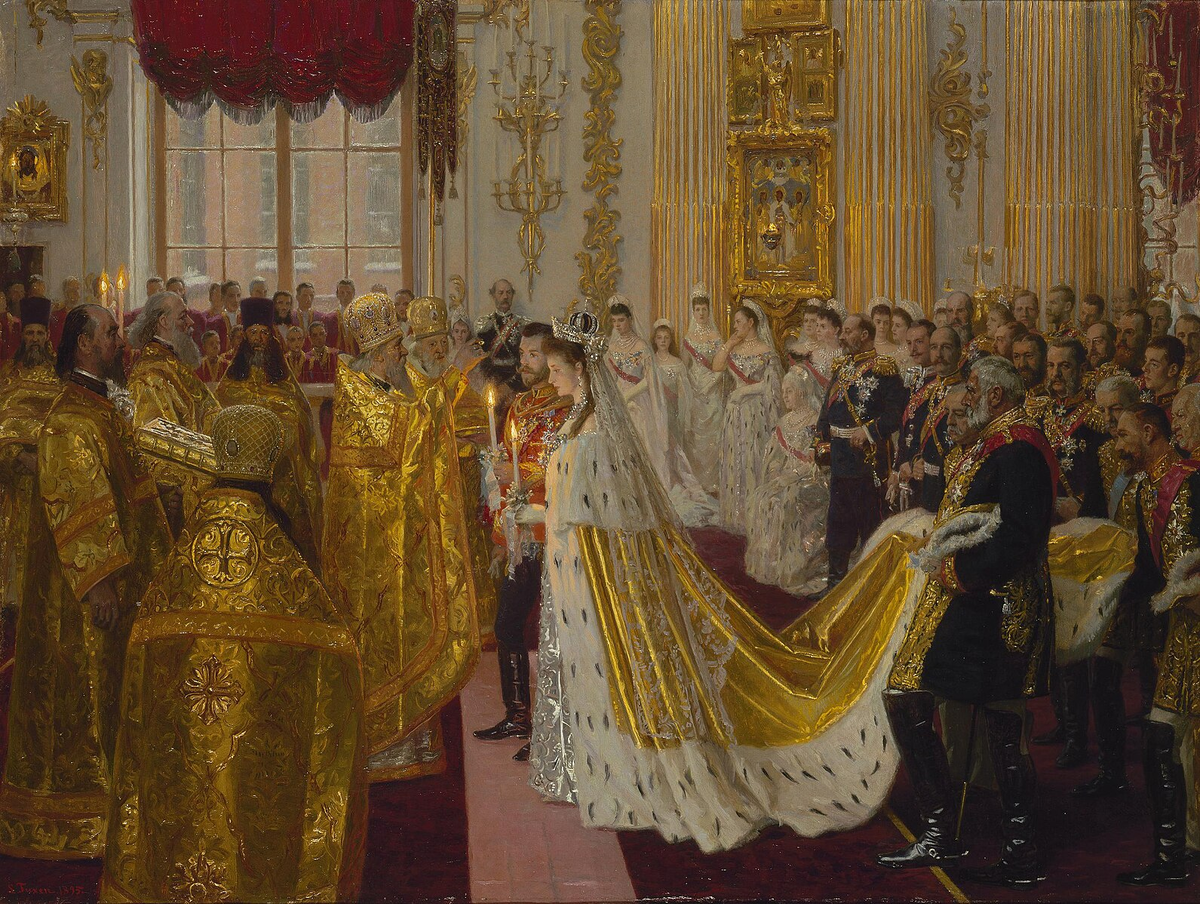 Алиса приняла православие с именем Александры Федоровны. Свадебное платье и императорская мантия были готовы в срок, кружевная фата передавалась по наследству – ее носила на своей свадьбе мать Алисы. Голову девушки венчала Романовская императорская свадебная корона, а ожерелье и серьги были выданы из сокровищницы и вместе весили… 475 каратов!