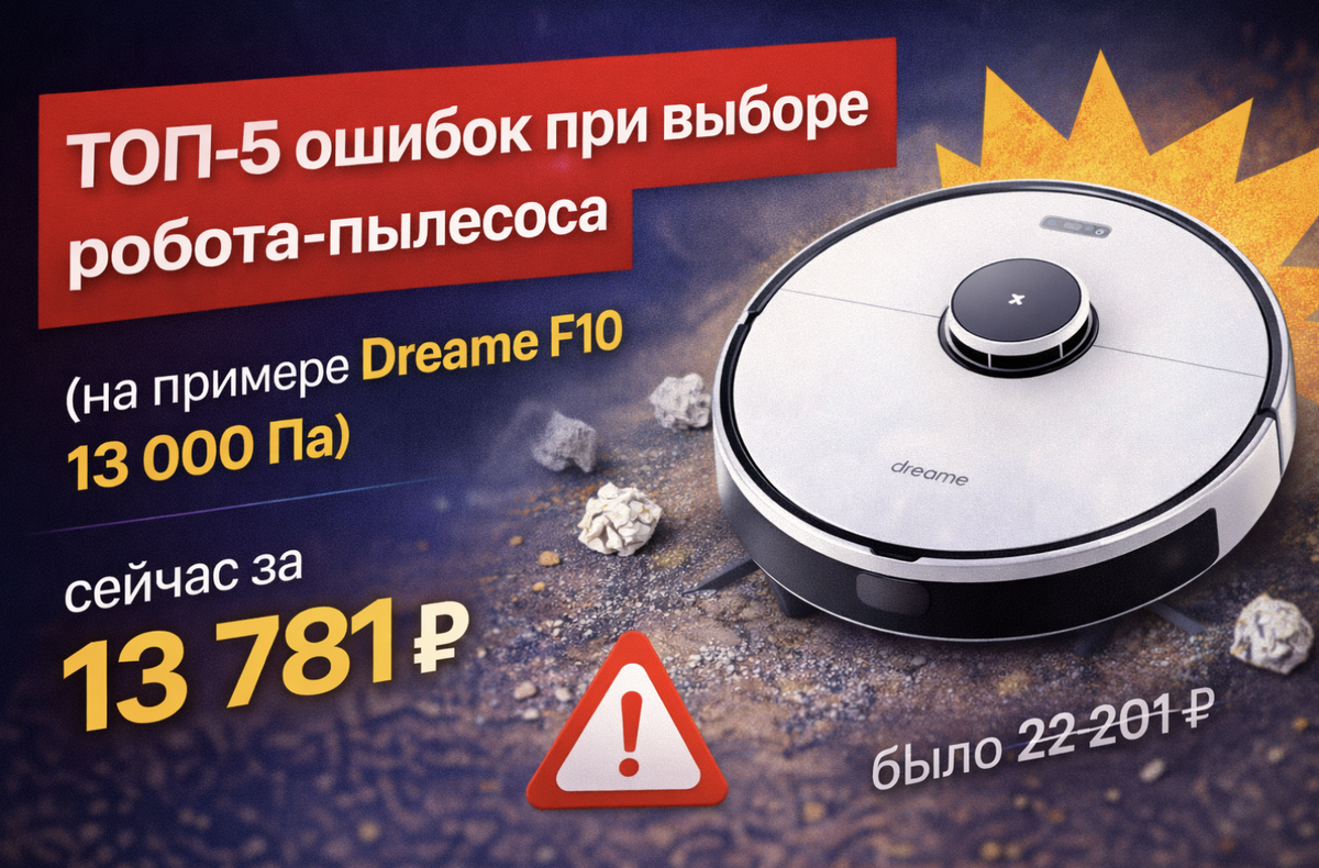 А если ошибиться — получится устройство, которое катается по квартире “для галочки”, застревает, пропускает мусор и в итоге стоит в углу. Разберу 5 ошибок, из-за которых чаще всего жалеют, и покажу на примере Dreame F10 (заявлено 13 000 Па, аккумулятор 5200 мА·ч). По вашей цене сейчас 13 781 ₽ вместо 22 201 ₽ — на скидке особенно важно выбрать с головой. Да, 13 000 Па звучит мощно. Но важно понимать, где эта мощность реально нужна. Как правильно: Вывод по Dreame F10: его сила — как раз в поддерживающей уборке на твёрдых покрытиях + ковры точечно. Частая история: купили робота, а он не успевает пройти квартиру и садится на полпути. Как правильно: Почему Dreame F10 в плюсе: заявлен аккумулятор 5200 мА·ч — это хороший запас для регулярной уборки без постоянной подзарядки посередине. Роботы не любят: Как правильно: И да: даже самый дорогой робот не станет умнее, если квартира превращена в полосу препятст