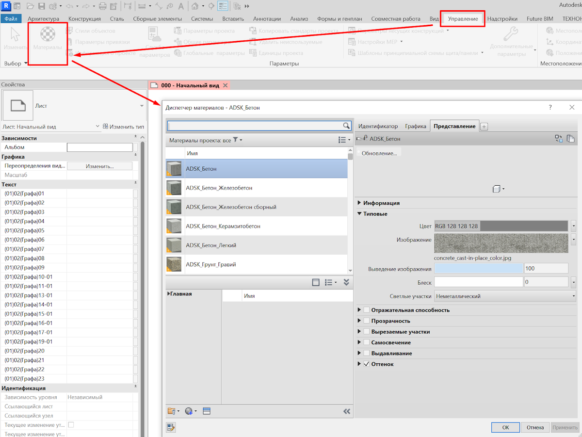 Текстуры в Revit используются для придания реалистичности модели зданий и объектов. В Revit можно применять текстуру на различные элементы модели, такие как стены, пол, потолки, окна и двери. Для вызова данной команды нам нужно перейти на вкладку «Управление» и перейти к материалам.