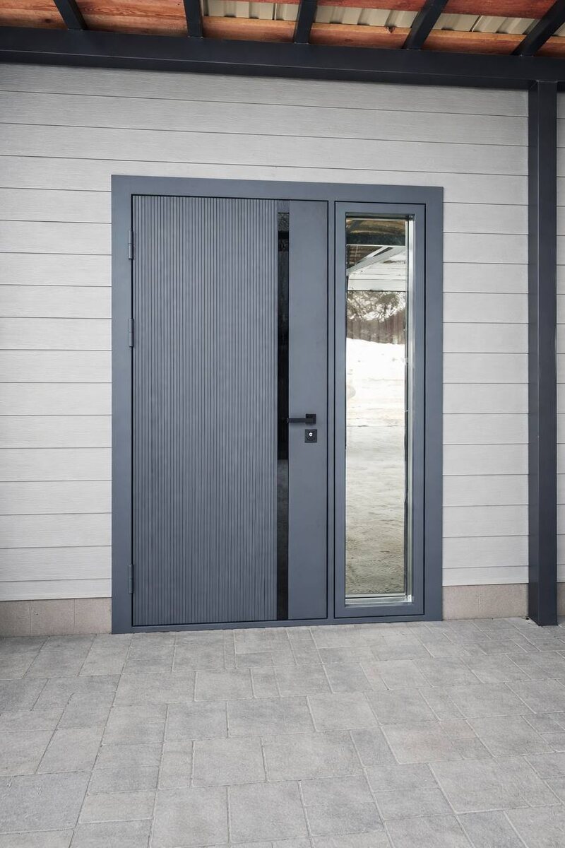 Установили входную уличную дверь с терморазрывом и большим панорамным остеклением. 🔹 Дизайн и отделка Внешняя и внутренняя отделка дверного полотна выполнена декоративными панелями МДФ, окрашенными эмалью, со вставками из чёрного стекла лакобель. Современный и универсальный вариант, который отлично вписывается как в интерьер, так и в фасад дома. 🔹 Конструкция и теплоизоляция Все наши двери с терморазрывом имеют: • толщину дверного полотна 120 мм • 4 слоя теплоизоляционных материалов • 3 контура уплотнения для максимальной герметичности Стеклопакет — толщиной 104 мм, 4-камерный, рассчитан на уличную эксплуатацию и сохранение тепла. 🔹 Фурнитура и безопасность Установлена чёрная фурнитура от российского бренда Armadillo. Замковая система — трёхригельный замок Guardian 3211 с непромерзающим цилиндром и термоштоком. 🔹 Индивидуальное изготовление Все двери мы изготавливаем на заказ: • под фактический размер дверного проёма • в нужном вам дизайне • с учётом интерьера и архитектуры до
