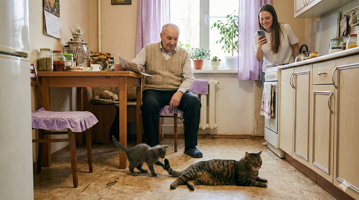 Всем привет! Меня зовут Даша. Мне 24, я работаю в IT, живу в ритме дедлайнов и зум-коллов. А еще я дочь Ларисы и Петровича. Да-да, того самого Петровича, который на весь интернет (и на весь подъезд) заявляет, что коты — это «шерстяное недоразумение», а сам тайком гуглит, можно ли котам пармезан.