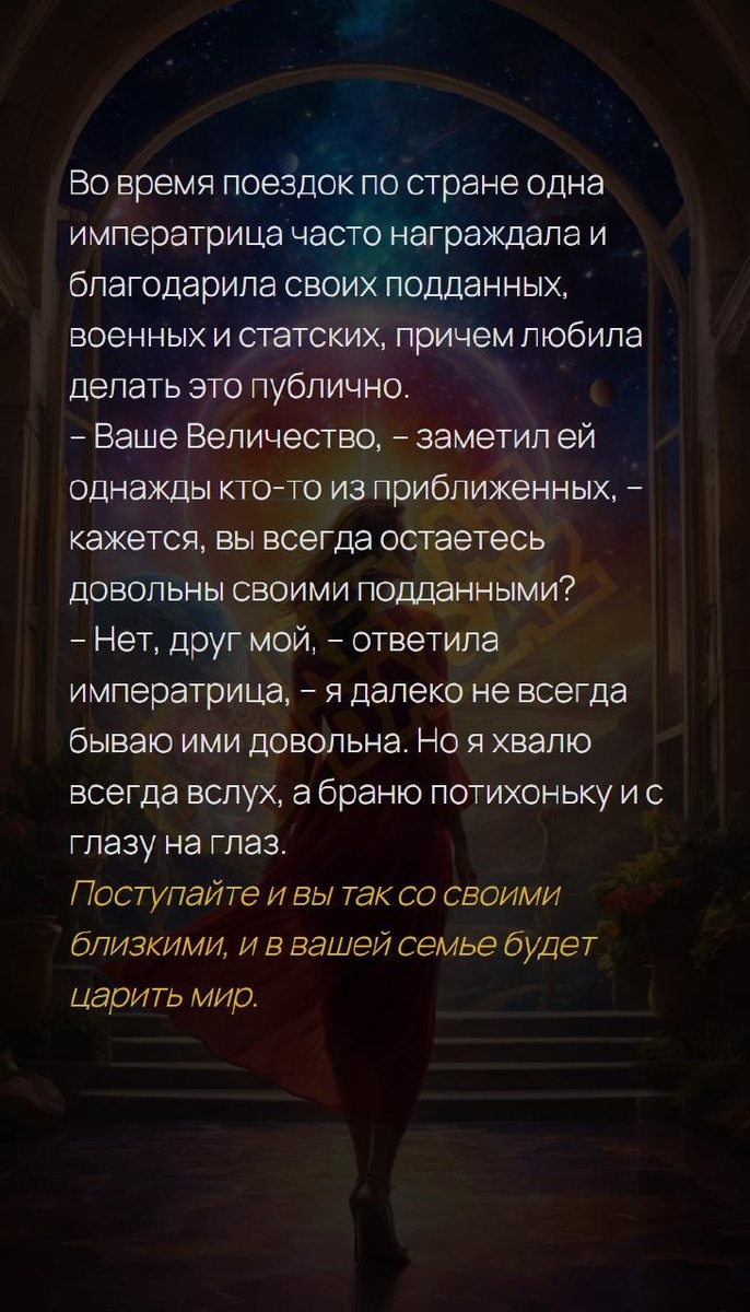 ✨ Во время поездок по стране одна императрица часто награждала и благодарила своих подданных, военных и статских, причем любила делать это публично. ✨ – :Ваше Величество, :– заметил ей однажды кто-то из приближенных, :– кажется, вы всегда остаетесь довольны своими подданными? ✨ – :Нет, друг мой, :– ответила императрица, :– я далеко не всегда бываю ими довольна. Но я хвалю всегда вслух, а браню потихоньку и с глазу на глаз. ✨ Поступайте и вы так со своими близкими, и в вашей семье будет царить мир. Архитектура вашей души | Натальная карта T | VK | Pin | YouTub | Dzen #подсказка #успехвделах #светлыймир #синхронность #уверенность #потоковоесостояние #магнитдляденег #перепрошивка #проводник #9число #9февраля
