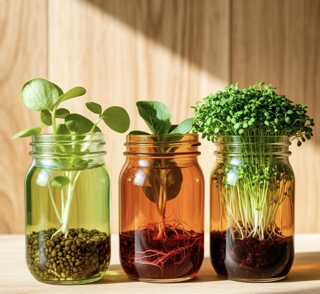 Технологическая суть: Вместо почвы используется гидрогель или агар-агар, обогащенный питательным раствором (NPK-комплекс для рассады). Этот гель заливается в стильную стеклянную банку (например, винтажную для варенья), сверху высеваются семена неприхотливых культур: редис, подсолнечник, горох, брокколи, руккола. Гелевая среда удерживает влагу и питание, отдавая их корням по мере необходимости. Клиенту нужно лишь открыть банку и поставить на свет.