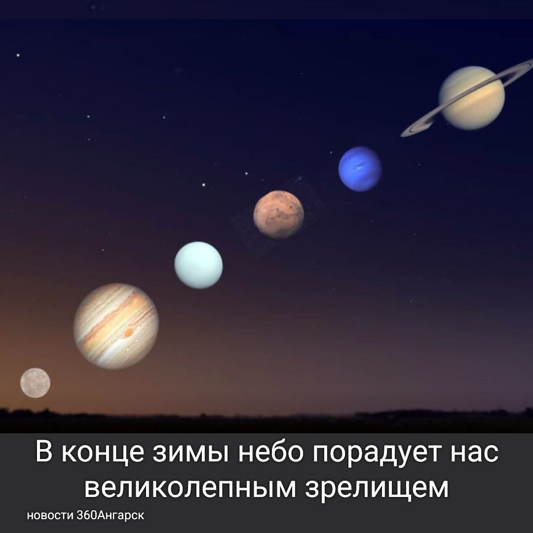 ! В конце зимы небо порадует нас великолепным зрелищем - сразу семь небесных тел, включая Меркурий, Венеру, Сатурн, Нептун, Юпитер, Уран и Луну, выстроятся в одну линию на одной стороне от Солнца. Это редкое явление можно будет наблюдать без телескопа, но будьте внимательны: увидеть все планеты одновременно удастся всего лишь в течение одного часа с 18:00 до 19:00.