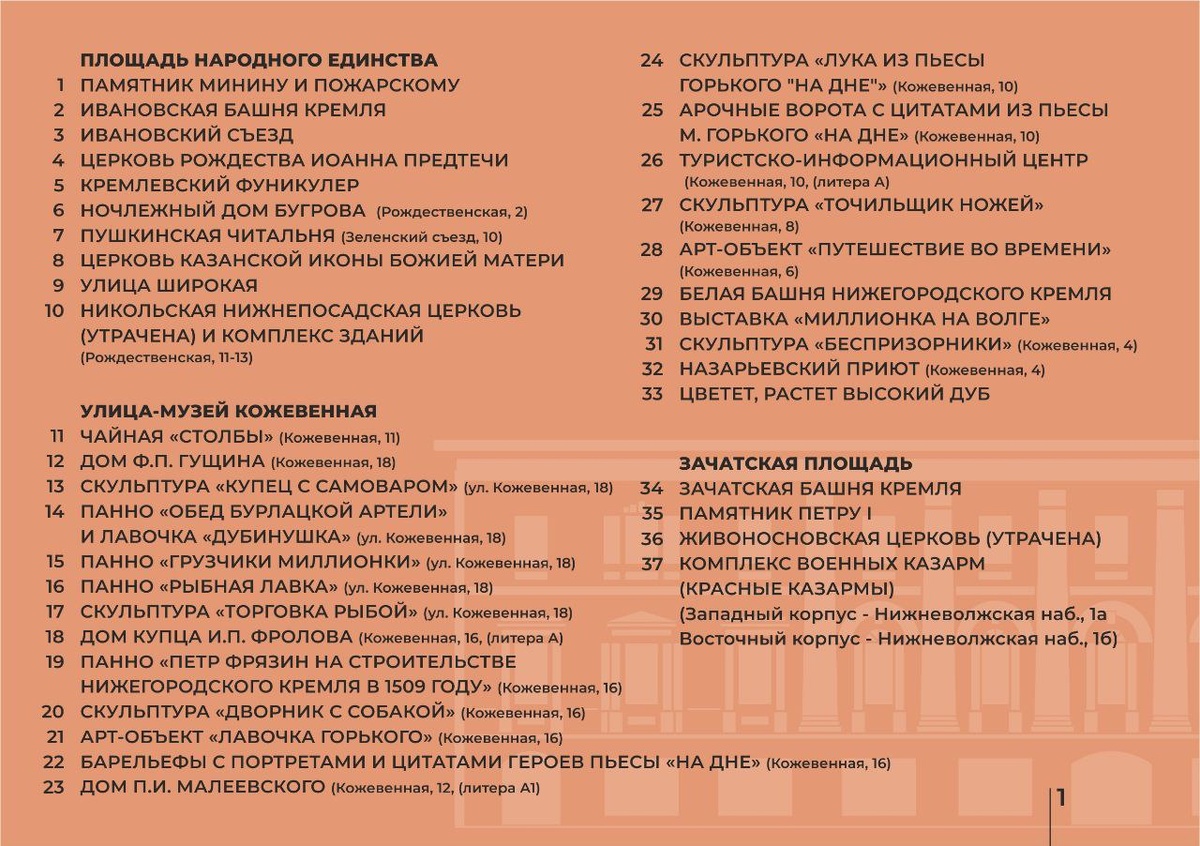 Вопрос об этом рассмотрят на заседании рабочей группы при правительстве Нижегородской области. Вопрос о подготовке нормативно-правовой базы для присвоения улице Кожевенной и прилегающих территорий статуса улицы-музея внесен в повестку февральского заседания рабочей группы при правительстве Нижегородской области под руководством заместителя губернатора Олега Берковича. Об этом корреспонденту ИА «Время Н» сообщил председатель правления благотворительного фонда «Земля Нижегородская» Александр Сериков. По его словам, если вопрос будет решен положительно, то в Нижнем Новгороде появится первая в России улица-музей. Фонд «Земля Нижегородская» активно занимается развитием территории улицы Кожевенной с 2017 года. Сейчас в реестр предполагаемого музейного пространства входят 37 объектов на Кожевенной, площадях Народного единства и Зачатской, включая кремлевский фуникулер, ночлежный дом Бугрова, чайную «Столбы», церкви, дома, скульптуры, уличные экспозиции, арт-объекты, барельефы, комплекс военны