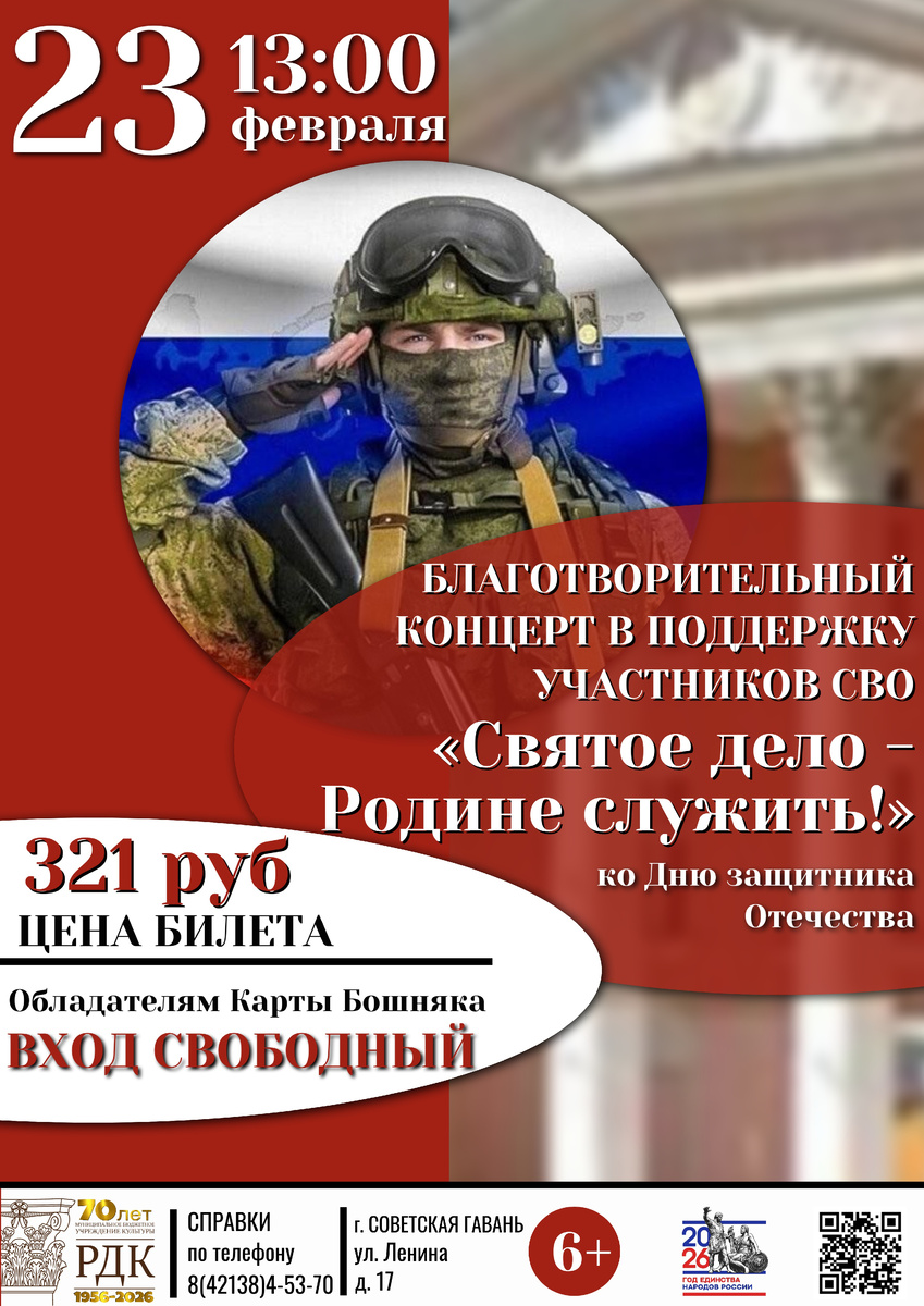 🎖23 февраля в нашей стране отмечается всенародный праздник - ДЕНЬ ЗАЩИТНИКА ОТЕЧЕСТВА, символизирующий глубокое уважение к благородным традициям наших предков, беззаветному и самоотверженному служению нашей Отчизне. 🇷🇺В этот день мы говорим искренние слова благодарности всем, кто защищает нашу Родину и всем, кто в военные годы вставал на защиту нашей страны, охраняя мир и покой граждан. ⭐Друзья, приглашаем Вас 23 февраля в 13:00 в Районный Дом Культуры на благотворительный праздничный концерт "Святое дело - Родине служить!", посвященный Дню защитника Отечества. 📎Перед концертом будут работать благотворительные площадки: - Мастер-класс "Плетение маскировочных сетей" - Аквагрим "Мы –ПАТРИОТЫ!" (платно) - Акция "Письмо солдату" - Пункт приема гуманитарной помощи - Беспроигрышная лотерея (платно) - Фотозона и многое другое. Все собранные средства с проданных билетов и площадок будут направлены в РОО "ЗА ПОБЕДОЙ ВМЕСТЕ" для организации закупок для наших героев. 🗓23.02.2026 🕐 13:00 🎫