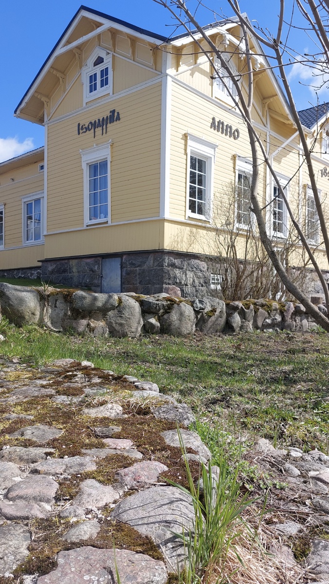 На одной из стен красуется надпись "Iso pappila”, что можно перевести, как «большая усадьба священника». И действительно, это был дом лютеранского пастора, точнее настоятеля лютеранского прихода Ряйсяля, существовавшего с 1635 года.