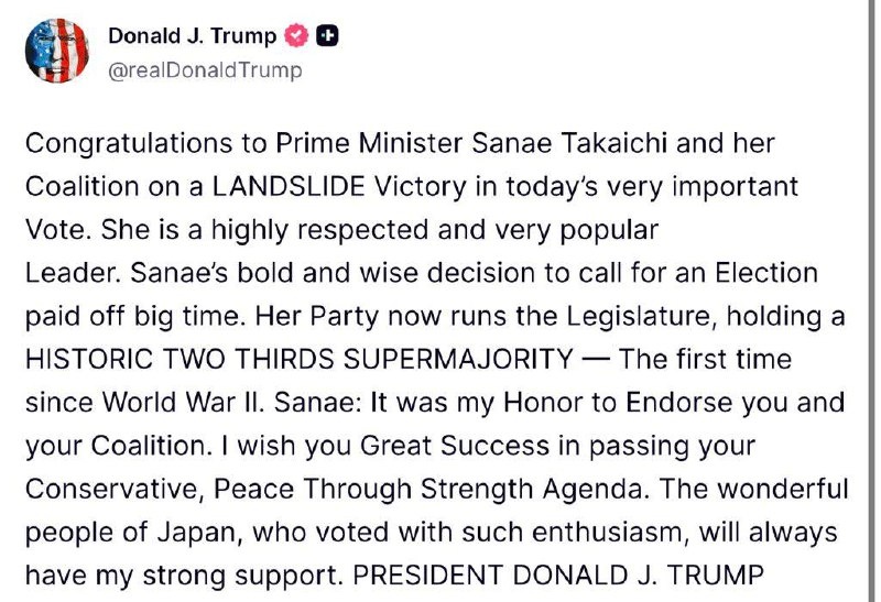 TRUMP: ‘Congratulations to Prime Minister Sanae Takaichi… on a LANDSLIDE Victory… my Honor to Endorse you… wish you Great Success in passing your Conservative, Peace Through Strength Agenda’