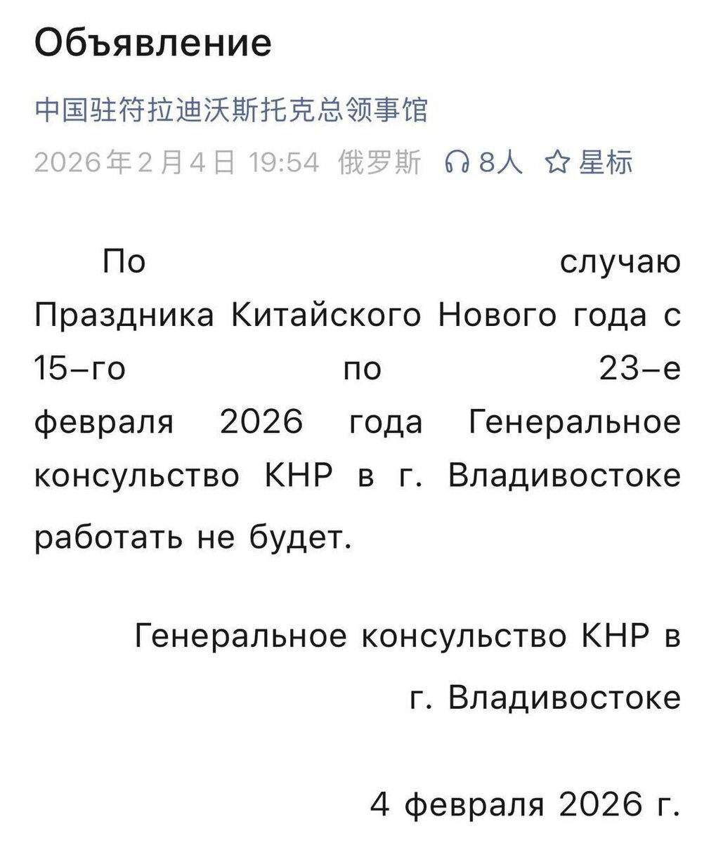 🇨🇳 Генконсульство КНР во Владивостоке не будет работать в период китайского Нового года