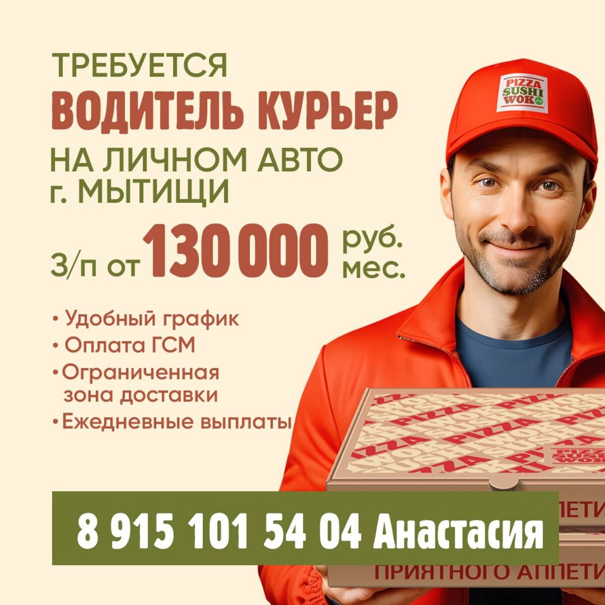 🚗 Присоединяйся к команде «PIZZASUHIWOK”. Стань водителем-курьером и зарабатывай от 130 000 руб. в месяц. ◽️Доход от 130 000 (Фиксированная ставка + оплата за каждый заказ + бонусы + чаевые) ◽️Минимальный доход за смену 5 000 - 8 000 руб. ◽️Работа рядом с домом ◽️Компенсация ГСМ, связи и интернета ◽️Ограниченная зона доставки Чем предстоит заниматься? ▪️Доставка пиццы, суши и вок ▪️Работа через удобное приложение ▪️Приём оплаты от клиентов Приходи, если ты имеешь личный автомобиль, уверенно пользуешься навигатором, а также пунктуален и вежлив. 🎁Приходи с другом и получи премию 10 000 руб.! Готов начать? Звони: +7 915 101 54 04, менеджер отдела подбора персонала Анастасия.