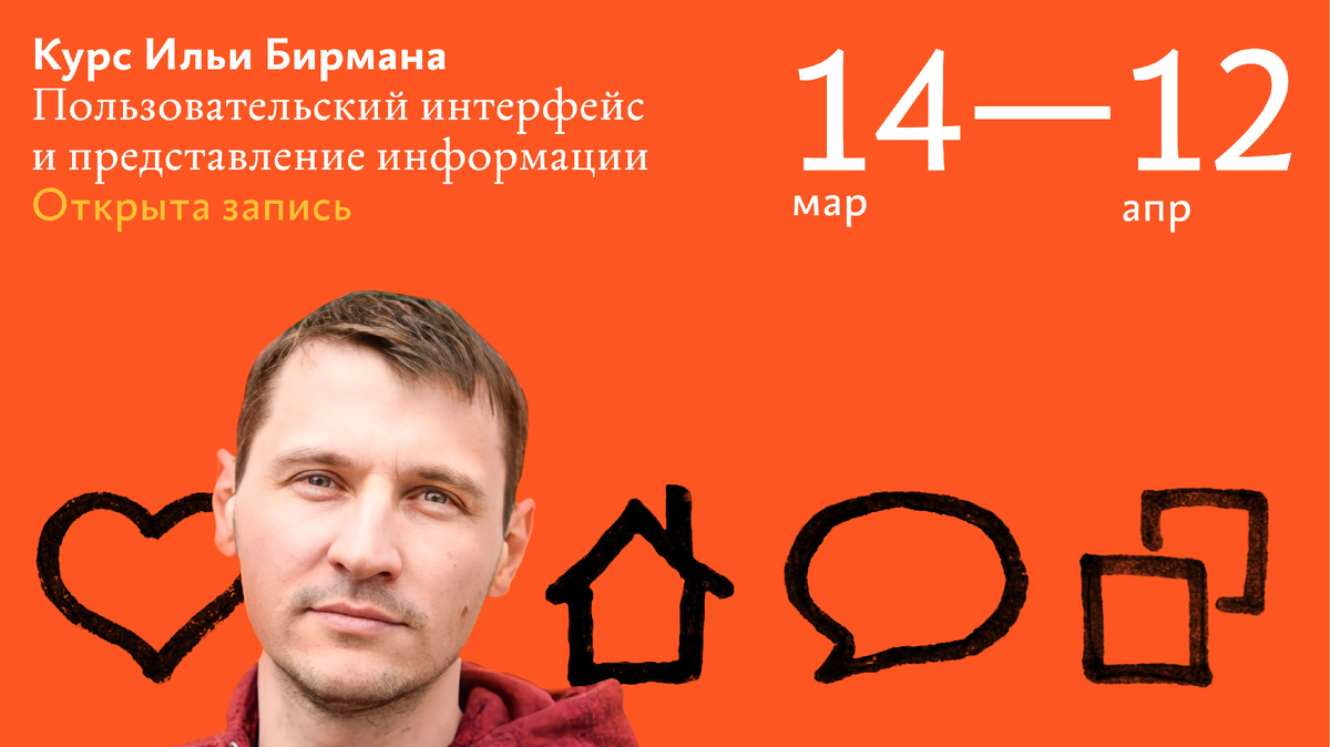 После 12 февраля — очередное повышение стоимости участия в курсе Ильи Бирмана «Пользовательский интерфейс и представление информации». Курс пройдёт в дистанционном формате 14 марта — 12 апреля. Классические примеры интерфейса, такие как Гугль‑карты, Айфон или калькулятор кредитов на сайте польского банка, демонстрируют универсальные принципы проектирования, которые не зависят от стандартов операционной системы, среды или устройства. Они работают и в компьютерах, и в телефонах, и в часах, и в голосовых помощниках, и в виртуальной реальности. Кроме общих принципов на курсе рассматриваются и важные детали: мобильная вёрстка, анимация, звук, пиктограммы. В задачах представления информации хороший дизайнер руководствуется её природой, физическими особенностями носителя, принципами восприятия и, главное, решаемой аналитической задачей. Эти идеи и принципы рассматриваются в теоретической части курса. На практических занятиях участники изучают приёмы проектирования экранных форм, дизайна табли