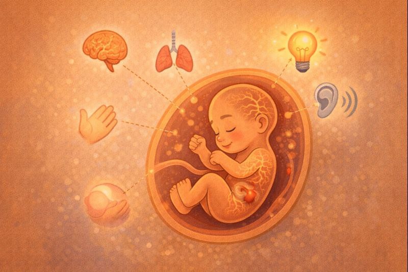 Малыш весит уже около 900–1000 грамм 👶 Он активно двигается и становится сильнее. Ребёнок может икать, моргать и сжимать кулачки. Он хорошо слышит и узнаёт знакомые голоса. Появляются периоды бодрствования и сна. Малыш всё чаще показывает свой характер 💛
