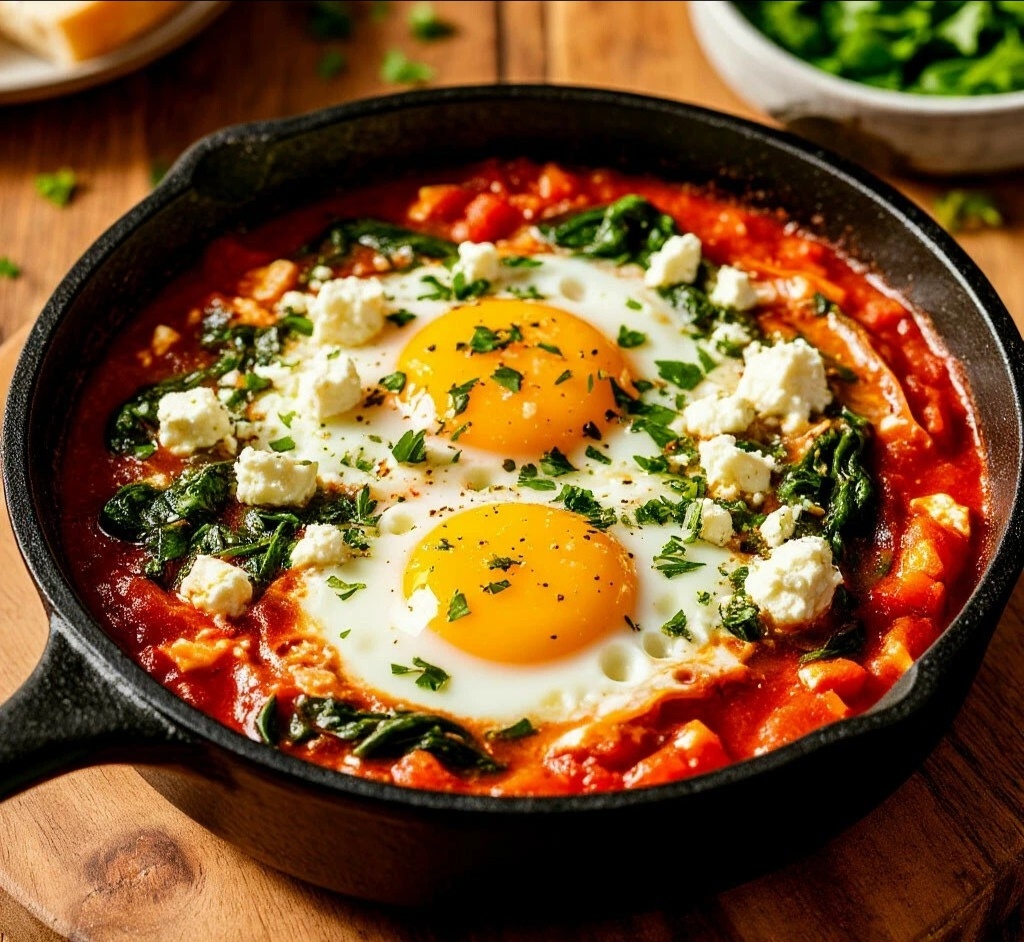 ИНГРЕДИЕНТЫ (на 2 порции): 🧾 ·Яйца — 3 шт. 🥚 ·Лук репчатый — 1 шт. 🧅 ·Чеснок — 2 зубчика 🧄 ·Консервированные рубленые томаты — 1 банка (400 г) или 4 спелых свежих помидора 🍅 ·Шпинат свежий — 100 г 🥬 ·Сыр фета — 70 г 🧀 ·Специи: сладкая паприка, кумин (зира), соль, чёрный перец — по ½ ч.л. ·Растительное масло — 2 ст.л. ·Свежая зелень (петрушка, кинза) — для подачи 🌿