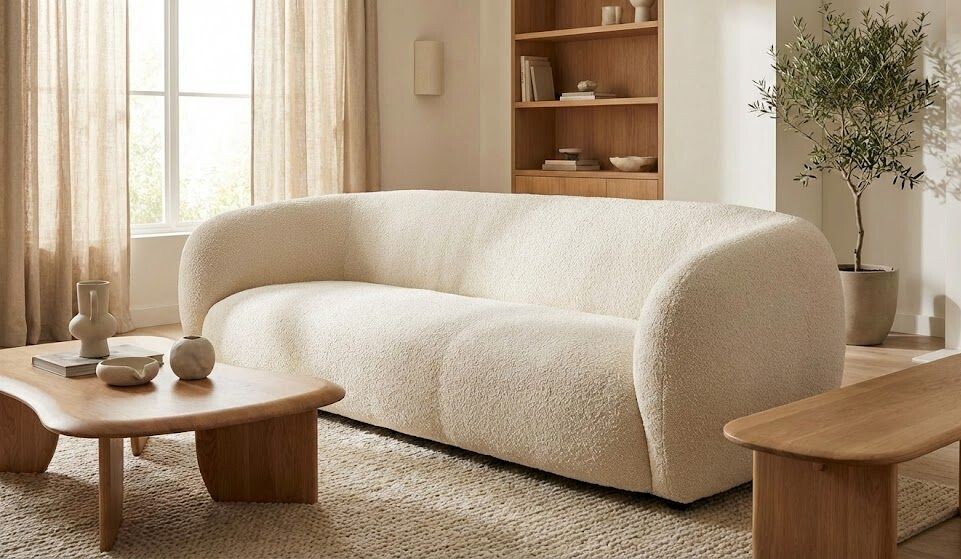 Но есть нюанс. Многие боятся покупать светлую буклированную мебель. «Она же испачкается за неделю!» - скажете вы. И будете отчасти правы. Но тренд 2026 года, о котором мы говорили в прошлой статье - это уход от белого. Сейчас в моде «грязное» букле: цвета некрашеной шерсти, серо-бежевое, кофейное, оливковое или терракотовое. На такой рябой фактуре пятна видны гораздо меньше, чем на гладком хлопке.