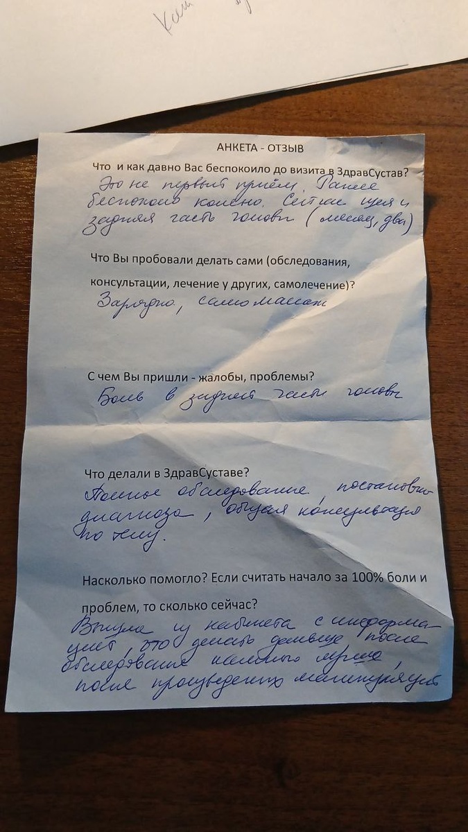 Расшифровал рукописный текст для тех, кому неудобно читать с фото: АНКЕТА - ОПРОС 1. ЧТО И КАК ДАВНО ВАС БЕСПОКОИЛО ДО ВИЗИТА В ЗДРАВСУСТАВ? - Это не первый приём. Ранее беспокоило колено. Сейчас шея и задняя часть головы (месяц, два). 2. ЧТО ВЫ ПРОБОВАЛИ ДЕЛАТЬ САМИ (ОБСЛЕДОВАНИЯ, КОНСУЛЬТАЦИИ, ЛЕЧЕНИЕ У ДРУГИХ, САМОЛЕЧЕНИЕ)? - Зарядка, самомассаж. 3. С ЧЕМ ВЫ ПРИШЛИ (ЖАЛОБЫ, ПРОБЛЕМЫ)? - Боль в задней части головы. 4. ЧТО ДЕЛАЛИ В ЗДРАВСУСТАВЕ? - Полное обследование, постановка диагноза, общая консультация по телу. 5. НАСКОЛЬКО ПОМОГЛО? ЕСЛИ СЧИТАТЬ НАЧАЛО ЗА 100% БОЛИ И ПРОБЛЕМ, ТО СКОЛЬКО СЕЙЧАС? - Вышла из кабинета с информацией, что делать дальше, после обследования намного лучше, после произведённых манипуляций. 6. ЧТО ВАМ ПОНРАВИЛОСЬ У НАС? - Чёткость, своевременность, профессионализм, доброта, искренность, большое желание помочь. 7. ЧТО НЕ ПОНРАВИЛОСЬ И МОЖНО УЛУЧШИТЬ? – 8. ПОРЕКОМЕНДУЕТЕ ЛИ ЗДРАВСУСТАВ СВОИМ БЛИЗКИМ И ЗНАКОМЫМ? Всегда рекомендую и рассказываю. - ТОЧНО ДА (выд