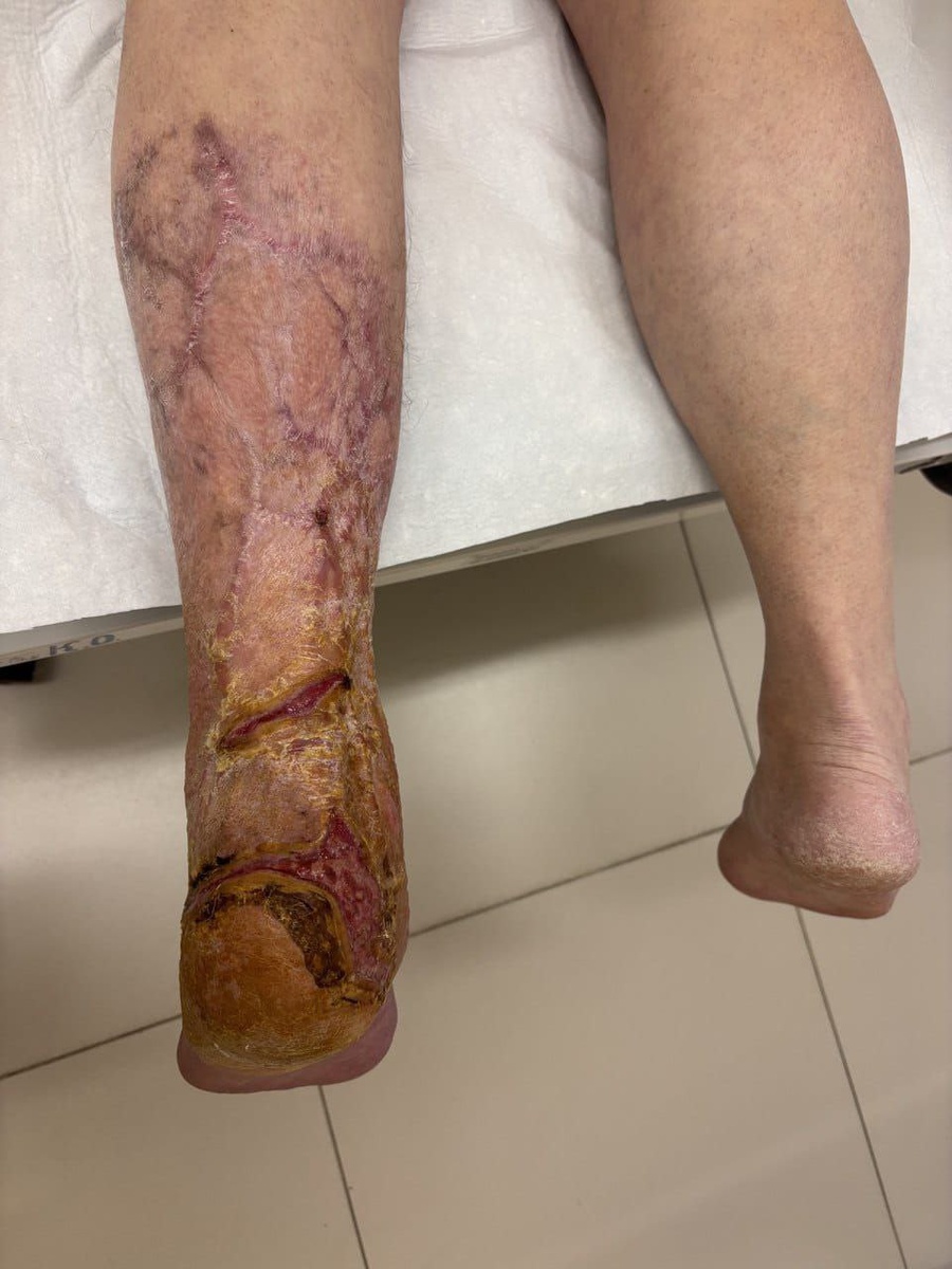 ) Врачи клиники спасли человека от инвалидности Полгода назад мужчина 61 года получил производственную травму - на него был совершен наезд транспортным средством, двигавшимся задним ходом. Из-за сильного механического воздействия произошло существенное разрушение мягких тканей голени и стопы и отслоение большой площади кожи. Была оказана экстренная специализированная помощь, проведено восемь пересадок кожи с бедра, однако на протяжении нескольких месяцев сохранялся внушительный отек, а также гнойные фиброзные отложения по всей голени и гнойная рана в пяточной области. Для продолжения лечения пациента направили в Санкт-Петербург, но результатов лечение не принесло. Тогда страховой представитель, который вел пациента на всем пути лечения, обратился в Университетскую клинику РУДН, где квалифицированные специалисты отделения гнойной хирургии и Клиники лечения боли имеет большой опыт в оказании помощи таким пациентам. 🔡В отделении гнойной терапии проведен очередной этап лечения стопы о