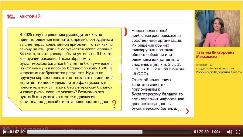 Но так как по закону на эти цели не допускается использование 84 счета, то эти расходы были учтены на 91 счете как прочие расходы. Таким образом в бухгалтерском балансе 84 счет не был уменьшен на эту сумму и в пассиве баланса по коду 1300 не корректно отображается результат. Нужно ли вручную корректировать этот показатель или нет? на этот и другие вопросы ответила Татьяна Максимова, государственный советник 3 класса, эксперт 1С в лекции на тему Бухгалтерская отчетность 2025 по правилам ФСБУ 4/2023 в вопросах и ответах Дополнительные материалы к лекции: ▫️Презентация лектора ▫️Пояснения к бухгалтерскому балансу и отчету о финансовых результатах ▫️Упрощенная бухгалтерская отчетность 👉 Смотрите бесплатно полную видеозапись лекции 🚨Подписывайтесь на @lector_1c