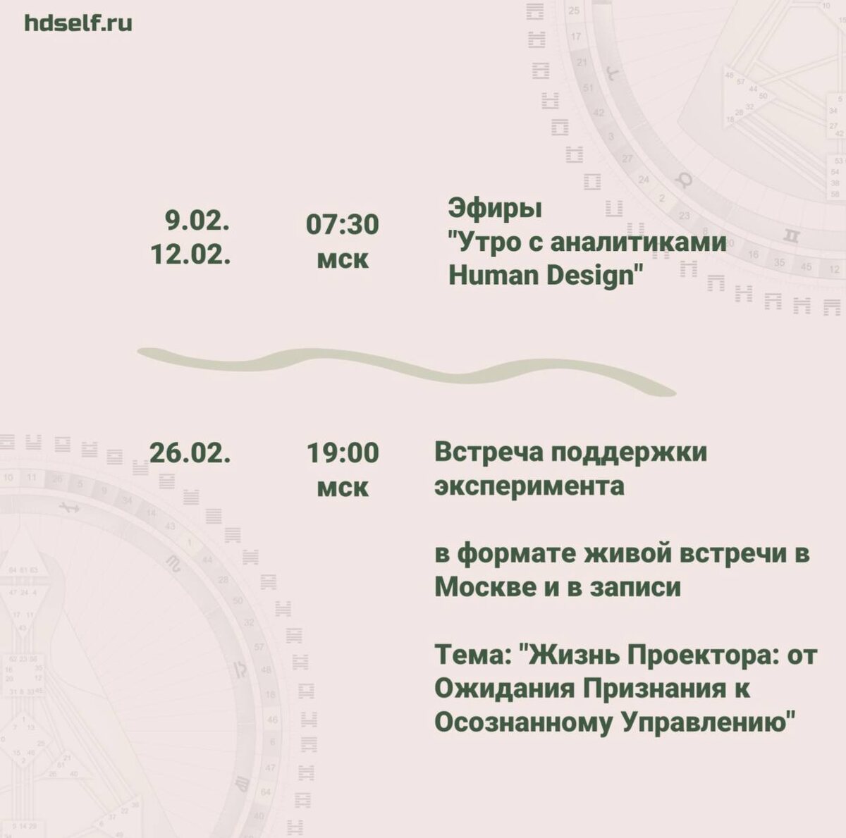 ▫️9.02. и 12.02 в 07:30 МСК в нашей группе ВКОНТАКТЕ "Утро с аналитиками Дизайн Человека" Тема недели "Кто или что влияет на решения человека?" ▫️26.02. в 19:00 МСК Встреча поддержки эксперимента в формате живой встречи в Москве и в записи Тема: "Жизнь Проектора: от Ожидания Признания к Осознанному Управлению" Записаться по ссылке Сохраните себе расписание, перешлите друзьям. И присоединяйтесь) #hdselfru_информационное