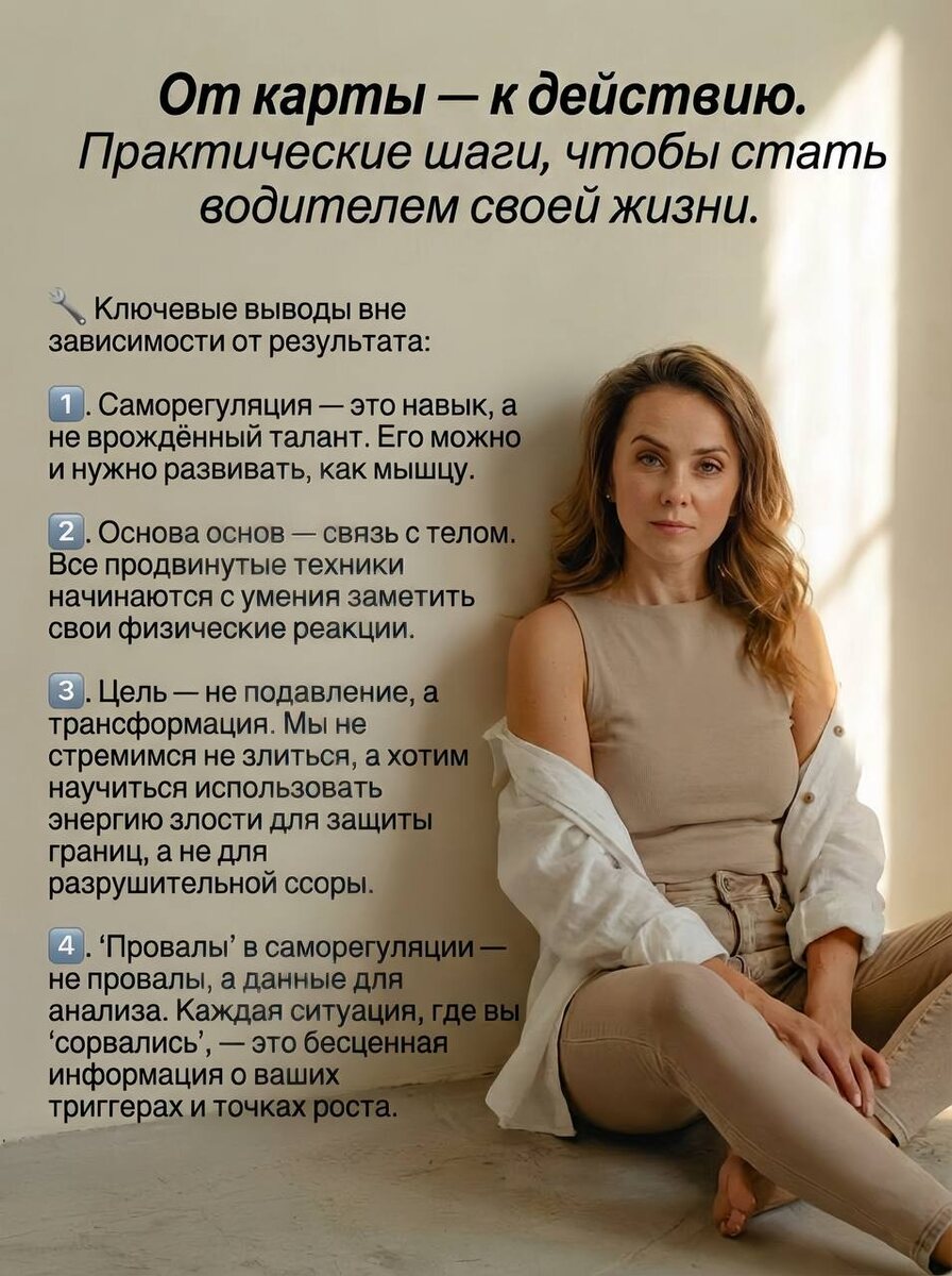 Практические шаги, чтобы стать водителем своей жизни. Вчера мы вместе с вами составили «Карту саморегуляции». Многие из вас честно ответили на вопросы и получили свой результат — будь то «Водитель», «Пассажир» или состояние «Смены полосы». Самый частый вопрос, который возник после теста: «А что теперь с этим делать?» Сегодня — не про теорию, а про первые, конкретные шаги. Независимо от вашего результата, начать можно с одного и того же фундамента. И что с этим делать прямо сейчас? Ваша нервная система привыкла к определённым, часто стрессовым, паттернам реагирования. Самый важный шаг для вас — начать с основ: уделить внимание телу. Начните с простого: отслеживайте, как эмоции отражаются в теле (где возникает зажим, тяжесть, дрожь). Осваивайте самые простые техники заземления (например, 3-5 глубоких вдохов-выдохов, ощущение опоры под стопами). Это фундамент, на котором можно будет строить более сложные навыки. 🔧 Ключевые выводы вне зависимости от результата: 1️⃣. Саморегуляция — э