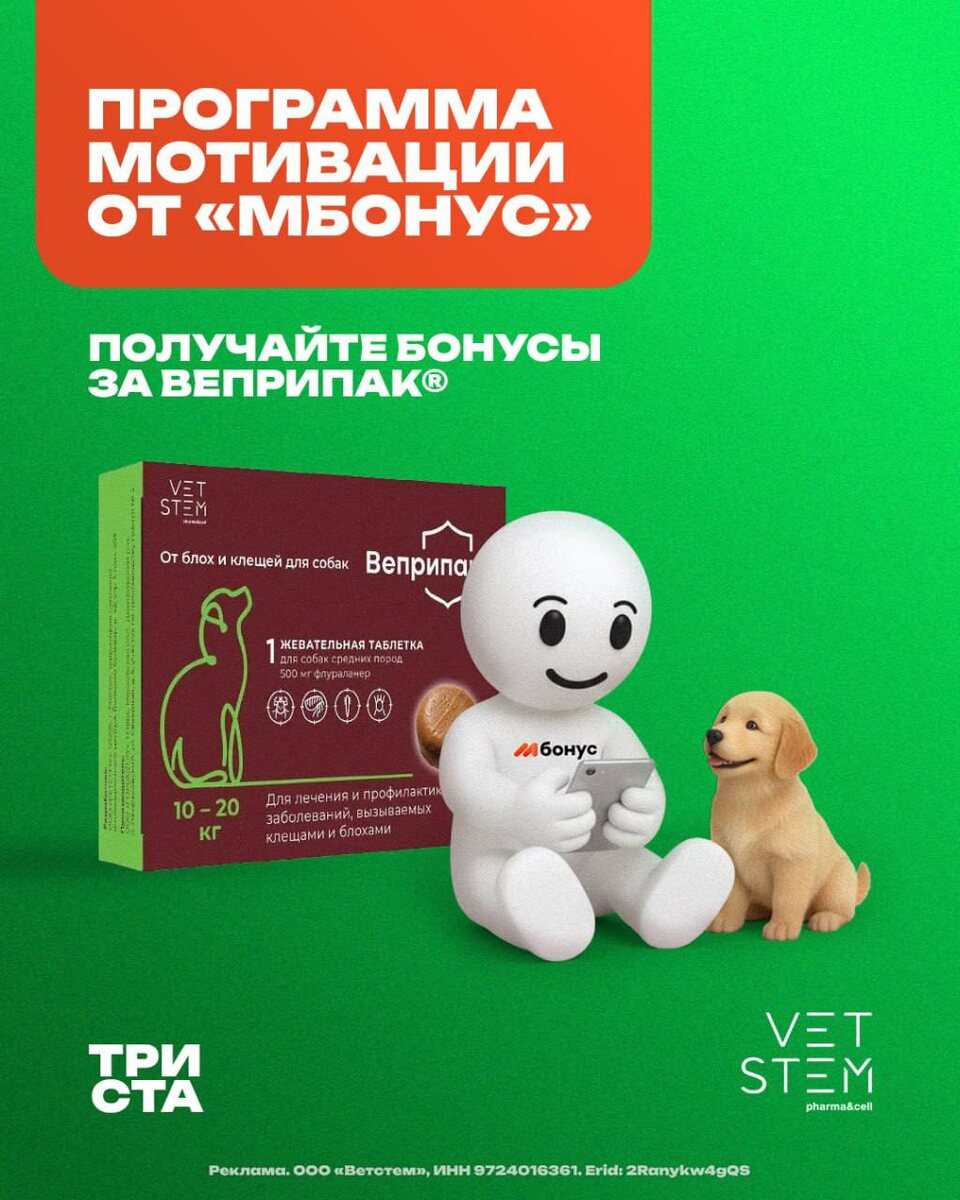 ® Менеджеры и продавцы зоомагазинов и ветаптек каждый день рекомендуют препараты клиентам. Вопрос только в одном: почему бы не получать за это дополнительный доход напрямую? Стартует программа мотивации «МБонус» за продажи Веприпак®. Веприпак® – первый официальный российский флураланер в форме жевательной таблетки для собак. Обеспечивает защиту от клещей и блох до 12 недель. Действующее вещество хорошо знакомо рынку – аналог Бравекто, без лишних объяснений для покупателя. Работает все максимально просто: 😀Рекомендуете Веприпак 😀Сканируете QR-код с кассового чека в приложении МБонус 😀Бонусы начисляются автоматически после проверки, а деньги можно вывести напрямую на банковскую карту. В итоге выигрывают все: питомец получает надежную защиту, клиент – понятный препарат, а вы – дополнительный доход. Начать зарабатывать в приложении: 😀RuStore 😀AppGallery 😀App Store 😀Google Play 🐾 Триста. Всё про зообизнес