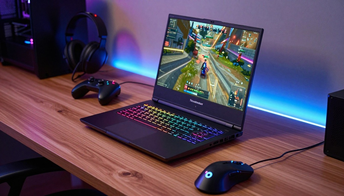 A sleek, modern gaming laptop sits open on a stylish, dark wooden desk. The laptop's vibrant RGB lighting illuminates the surroundings, casting colorful reflections. The screen displays a high-resolution game scene, showcasing sharp graphics and dynamic colors. Surround the laptop with gaming accessories like a mechanical keyboard and a gaming mouse, both with RGB elements, enhancing the tech vibe. In the background, a softly lit room with minimalistic decor hints at a dedicated gaming space. The scene is captured from a slightly elevated angle, focusing on the laptop while the ambient light creates a warm, inviting atmosphere. This image conveys a sense of excitement and immersion in gaming culture.